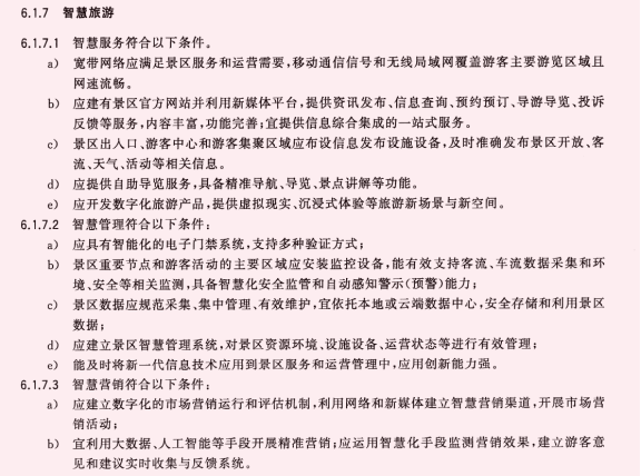 《旅游景区质量等级划分》6.1.7条款作为智慧旅游建设的纲领性标准,通过智慧服务、智慧管理、智慧营销三大模块构建了系统化评价体系。该标准不仅明确了5A景区数字化建设的底线要求,更推动行业从“粗放式信息化”向“精细化智慧化”转型。
