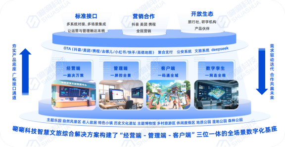 唰唰科技智慧文旅综合解决方案以“全流程体验重构、全场景智能协同、全链路数据驱动”为核心架构,通过“云-边-端”三层技术部署,构建起覆盖游客服务、运营管理、商业转化的一体化智慧生态。方案独创的“三横三纵”能力体系,横向打通服务、管理、营销三大业务域,纵向贯穿基础设施层、数据中台层、应用服务层,形成技术架构与业务需求的深度耦合。通过合规性筑基、体验增值、管理提效、收益倍增的四维价值体系,为5A申报景区构建数字化竞争优势。